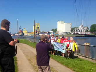 An den neun Tagesetappen bei durchweg schönstem Wetter haben insgesamt 170 Radlerinnen und Radler teilgenommen. In Kiel hatte bis 1923 eine dritte deutsche Schwebefähre gestanden. Im Kieler Fährhafen hatte am Mittwoch voriger Woche - sozusagen in Verlängerung der "Fährenstrasse" - eine dreitägige Oslo-Fahrt auf einem "Kreuzfährschiff"begonnen, die 55 Ostefreunde gebucht hatten. ![]() Mit der Rückfahrt der Radstaffetten-Teilnehmer vom ADFC Cuxhaven, die am Montag die Flagge nach Osterrönfeld gebracht hatten, enden am heutigen Mittwoch die Veranstaltungen zum Fährstraßen-Jubiläum.