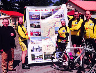Die ersten Fähre Nr. 1: Auf dem Spielplatz Vörder See 12. 5. 2014. Bei klarem Himmel, in bester Stimmung, mit Abschiedsgrüßen von Vizebürgermeister Rolf Hüchting und den Stadt-Touristikern Benjamin Bünning und Barbara Norden sowie mit einem Radler-Cocktail, serviert von Oste-Hotel-Direktorin Sylke König-Sander, begann in Bremervörde am Montag die Staffeltour Oste - Ostsee auf der Grünen Route der Deutschen Fährstraße nach Kiel. Apfel-Power Sylke König-Sander und Wolf-Lothar Berger Kleiner Imbiss nach der Fährfahrt Erstes Etappenziel der "Fährrad"-Tour unter Leitung von Gästeführer Wolf-Lothar Berger war - nach einem Zwischenstopp an der Kinderfähre am Vörder See - die Oste-Fähre in Gräpel. Dorf begrüßte Renate Bölsche vom Osteland-Vorstand die Radler mit Äpfeln aus der Ostemarsch, und Wirtin Karin Plate lud zur Einkehr in ihren schönen Wintergarten mit Osteblick. Viele Fotos von der 1. Etappe stehen auf dieser SONDERSEITE. Medienthema ![]() Die Staffelflagge wird signiert,... ... dann heisst es "Fährmann, hol över" 13. 5. 2014. Bei Traumwetter beteiligten sich zwei Dutzend Radler an der 2. Etappe der "Fährrad"-Staffel nach Kiel. Ausgangspunkt war die Stadt Bremervörde, wo ein Foto vom Start heute die Lokalzeitung schmückt. Lokaltitel der Bremervörder Zeitung Start zur ersten Etappe am 12. Mai Begrüßt mit einem Erdbeer-Milchshake aus Plate's Gasthof "Zum Osteblick" an der Prahmfähre in Gräpel, signierten alle Teilnehmer zunächst die große Staffel-Flagge, die binnen zehn Tagen nach Kiel gebracht werden soll. Nach der Überfahrt in Brobergen... ...führt die Route in die "Klinter Schweiz" Zunächst ging's über die Fähren in Gräpel und Brobergen. Dann wurde der "Püttenhüpper"-Heimathafen Hechthausen-Klint angesteuert. Der Radsportverein Hemmoor übernimmt... ... die Staffelflagge auf dem Geesthof Auf dem Ferienhof Geesthof, wo die AG-Osteland-Mitglieder Hubertus und Clemens von Marschalck die Radler begrüßten, nahm eine sechsköpfige Delegation des jungenRadsportvereins Hemmoor die Staffelflagge entgegen.