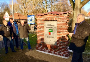 3. 12. 2016. Mauerwerk statt Hinkelstein. Weil Oberndorf "Geburtsstätte des Backsteins" sind, wie die NEZ feststellt, ist das Denkmal zur 700-Jahr-Feier aus Ziegeln gemauert statt aus einem Findling gestaltet worden. "Wir sind kein Hinkelstein-Dorf," sagte Bürgermeister Horeis (r.) heute bei der Enthüllung. Bericht, Video und viele Fotos > AKTUELL