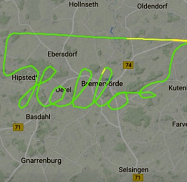 3. 12. 2016. "Hello" überm Osteland. Ein Pilot vom Luftsportverein Stade hat über dem Osteland zwischen Oldendorf und Selsingen einen Gruß auf den Flugradarschirmen hinterlassen: "Hello". Sichtbar gemacht wird die Botschaft beispielsweise über den Onlinedienst Flightradar 24. Sogar die britische Presse berichtet über den spektakulären Vorgang. > GUARDIAN