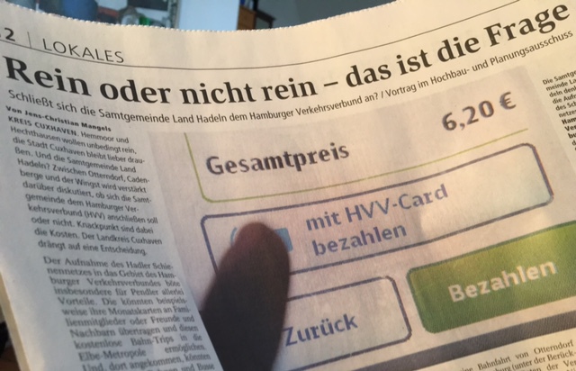 9.12. 2016. Jetzt auch Hadeln? Mit jahrelanger Verspätung hat das Land Hadeln jetzt begonnen, über einen Anschluss an den HVV nachzudenken, wie die NEZ (Foto) berichtet. Während Hemmoor seit mehr als 10 Jahren in den HVV drängt (Archiv), wird über die Einbeziehung von Otterndorf, Cadenberge und Wingst erst seit kurzem diskutiert. > LANDWUT-LANDMUT