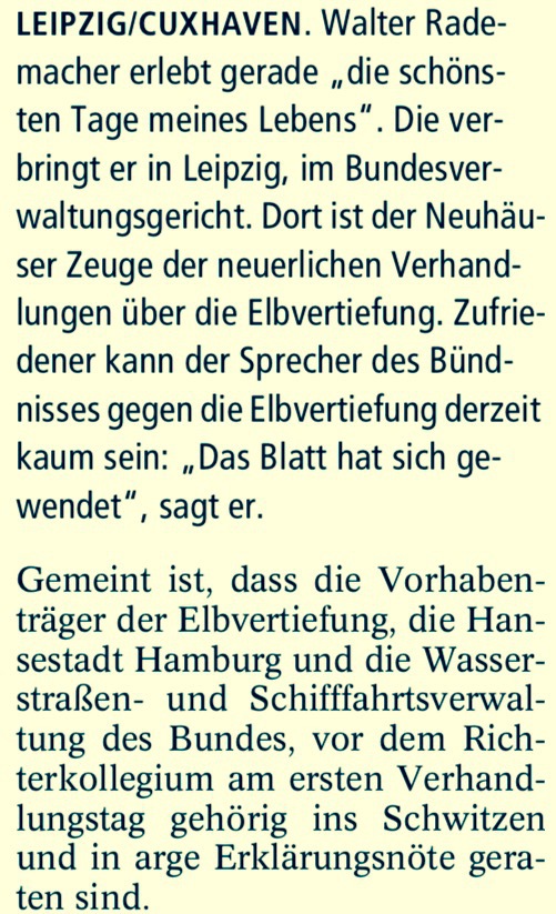 21. 12. 2016. Äußerst optimistisch zeigt sich AG-Osteland-Vize Walter Rademacher (5.v.l.) im Leipziger Elbverfahren (siehe Ausschnitt aus der heutigen NEZ). - Im Newsletter der Hamburger "Zeit" ist unter dem Titel "Einmal nachbessern, bitte" heute zu lesen: "Seit Montag befasst sich das Leipziger Bundesverwaltungsgericht mit einer Frage: Sind die Pläne zur Ausbaggerung der Elbe rechtmäßig oder nicht? An Tag zwei der Anhörung erreichten uns Neuigkeiten: Stadt und Bund werden ihre Pläne nachbessern. So werde man laut NDR auf das Schlickbaggern und das Umlagern von Schlick im Frühsommer verzichten, zum Schutz der Finte, einer Fischart. Einer der Gründe, wieso Bund und Stadt dennoch zumindest bangen dürften, ist das Tempolimit für Schiffe. Notwendig, sagen die Befürworter Nabu, BUND und Co., weil die hohen Wellen sonst Mensch und Natur gefährden. Laut »Hamburger Abendblatt« liegt jedoch das bereits vor zwei Jahren verlangte Überwachungssystem immer noch nicht vor. Susanne Meinecke, Pressesprecherin der Behörde für Wirtschaft, sagte uns dazu nur: »Das ist im Verfahren aus unserer Sicht kein strittiger oder entscheidender Punkt.« Mit Verweis auf die 260.000 Arbeitsplätze, die am Hafen hingen, bleibt die Stadt bei ihrer Argumentation. - Mit einem Entscheid in diesem Jahr ist wohl nicht mehr zu rechnen. Man erwartet, dass die Richter ihr Urteil Anfang nächsten Jahres verkünden. Heute, am letzten der drei angesetzten Verhandlungstage, wird erst mal weiter über das Wasserrecht diskutiert."
