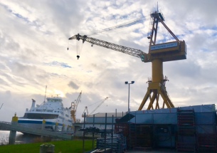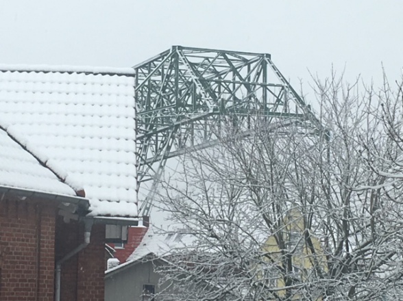 7. 1. 2018. Zwei Jahre nach der Havarie der zweitältesten deutschen Schwebefähre über dem Nord-Ostsee-Kanal bei Rendsburg am 8. Januar 2016 liegt das Wrack der irreparabel beschädigten Gondel weiterhin im benachbarten Diensthafen der Schifffahrtsverwaltung (Foto: Jochen Bölsche) - und eine Auftragsvergabe für den Neubau einer Schwebefähre 2.0 ist noch immer nicht erfolgt!