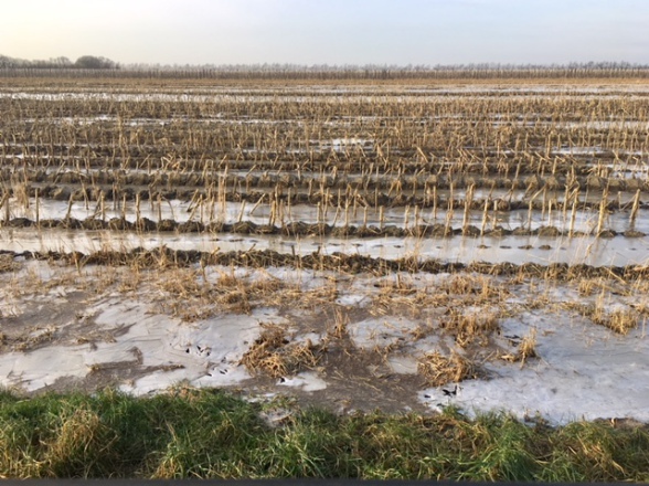 9. 1. 2018. Der Frost verwandelt das nasse Dreieck: Abgeerntete und überfrorene Maisfelder zwischen Oste und Elbe (Foto: J. Bölsche).