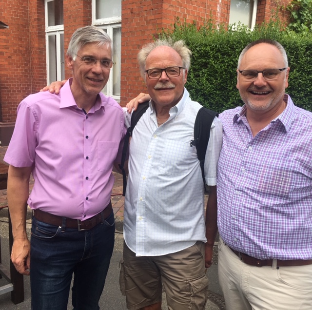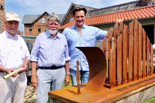 19. 6. 2019. Am gestrigen Dienstag stellte der Vorstand des Kornspeichers Freiburg seinen Förderern und Helfern die neu gestaltete Außenanlage vor (Foto: List). Die Veranstaltung begann mit der Einweihung eines Sturmflutdenkmals, das der im letzten Jahr verstorbene Künstler Gerd Rehpenning in Zusammenarbeit mit dem Hesedorfer Kunstschmied Ralf Schiefbahn (r.) nach einer Idee von Rainer Leive (l.) geschaffen hat.