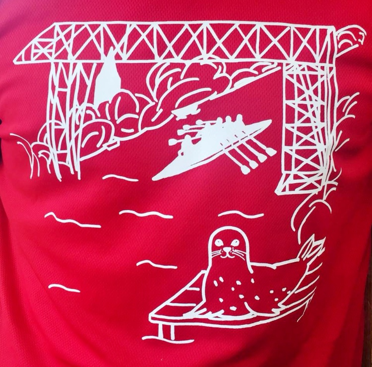 Unsere Abbildung zeigt das neue T-Shirt der Wasserfreunde mit der Schwebefähre und dem Seehund, der gelegentlich auf dem Anleger des Vereins gastiert.