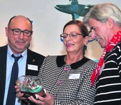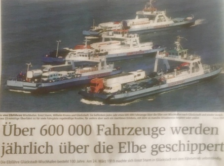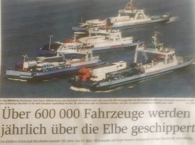 23. 3. 2019. An diesem Wochenende jährt sich zum 100. mal die Gründung der Elbfähre Glückstadt - Wischhafen, Anlass für Ulrich Rohde von der Niederelbe-Zeitung, diesem Ereignis einen ganzseitigen Rückblick zu widmen (Lesetipp!). Die vier Fährschiffe stellen das Bindeglied zwischen dem Nord- und dem Südabschnitt der vor 15 Jahren von der AG Osteland eröffneten Deutschen Fährstraße Bremervörde - Kiel dar. Herzlichen Glückwunsch! - Unser Archivbild zeigt die Elbfähren-Geschäftsführerin Hildegard Both-Walberg als Ehrengast beim „Tag der Oste“.