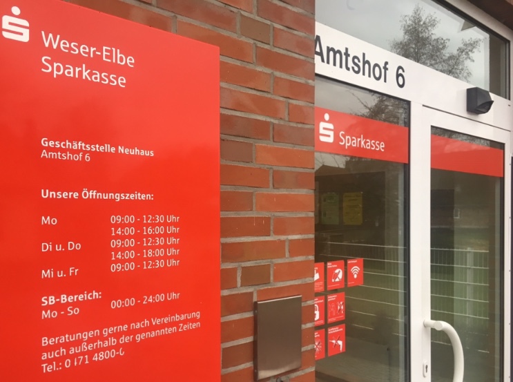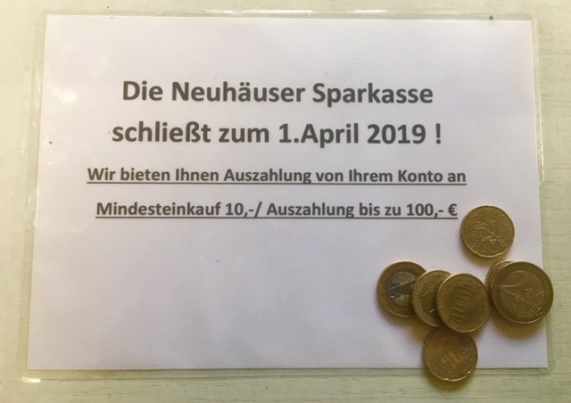 Aktuell20. 3. 2019. Trotz aller Proteste (wir berichteten mehrfach) schließt die Wespa Anfang April auch ihre Filiale in Neuhaus (Foto: Bölsche) - ohne auch nur einen Geldautomaten zu hinterlassen. Gut für die Oste-Gemeinde: Bei kleineren Beträgen springt jetzt der multifunktionelle Dorfladen (mit Klönstuv und Poststelle) von Ostepreisträgerin Wiebke Tum Suden ein (siehe Aushang)