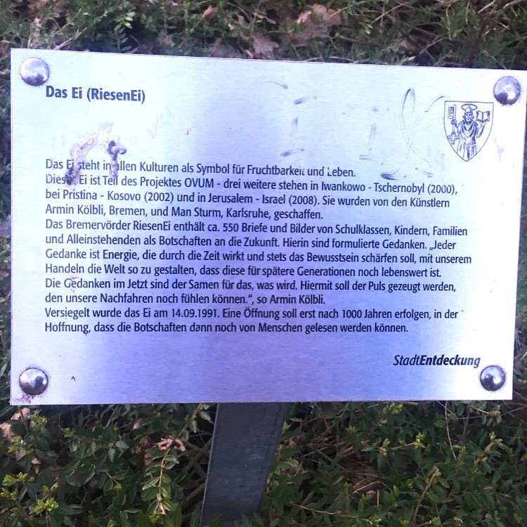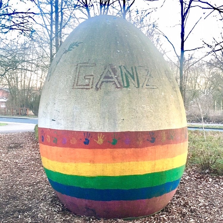 Das bekannteste XXL-Ei, von Künstlerhand geschaffen, steht nahe dem Startpunkt der Deutschen Fährstraße Bremervörde - Kiel am Vörder See; drei weitere dieser Art wurden in Jerusalem, im Kosovo und in Tschernobyl aufgestellt, wie der Infotafel zu entnehmen ist.