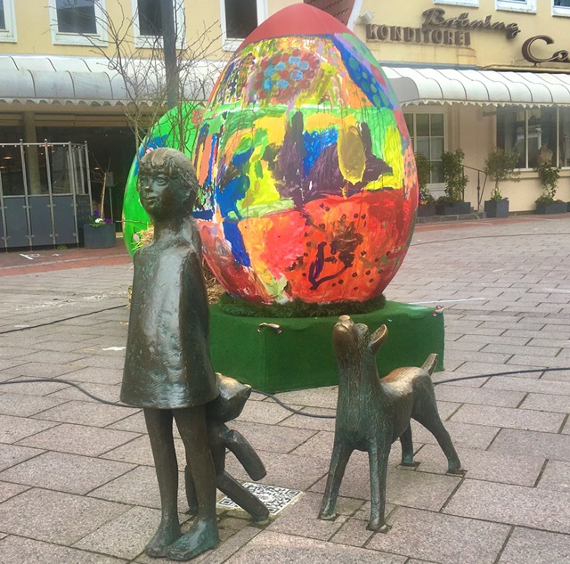 Auch die anderen Riesenei-Fotos sind diese Woche im oder am Rande des Ostelands entstanden: ein Eier-Ei in einem Garten in Kehdingbruch, das gelbe Exemplar vor dem Dorfkrug in Brauel, ein Kranz-Ei in Ostereistedt und „Ottereier“ aus Beton in Otterndorf (Fotos: Bölsche).