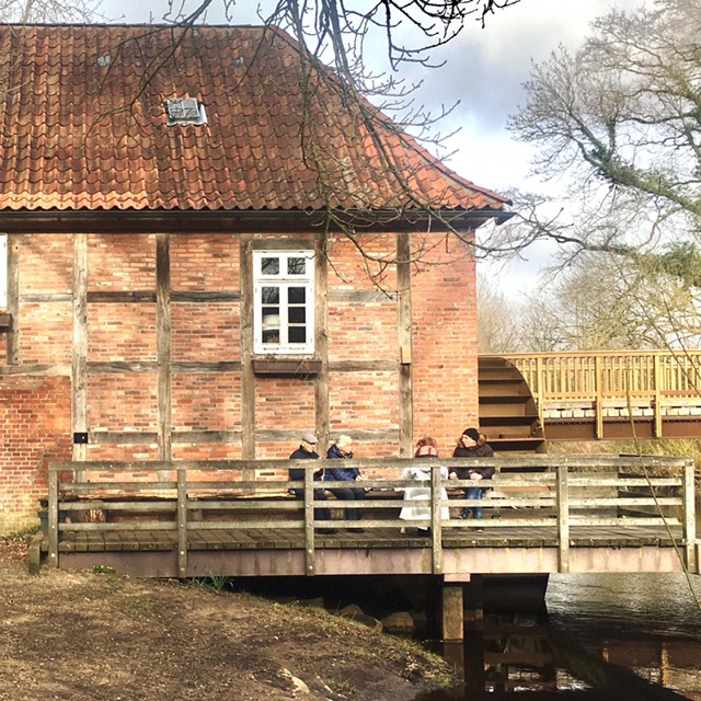 Andere nutzen die luftige Außenterrasse über dem Mühlrad für eine Pause mit mitgebrachtem Kaffee und Kuchen aus Thermoskanne und Tupperdose (Foto: Bölsche). Übrigens: Die Betreiberfamilie Martin bietet in ihrem Selsinger Landgasthof die berühmten Ostecafé-Torten außerhalb der Saison auch „to go“ an.