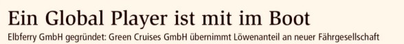 26. 11. 2018. Jüngste Presseberichte (Ausschnitt: CN/NEZ) stützen die Hoffnung, dass entgegen allen Unkenrufen schon im April eine weitere Fähre an der Deutschen Fährstraße Bremervörde - Brunsbüttel - Kiel verkehren wird (Archivfoto: Bölsche). Demnach übernimmt die Green Cruises GmbH - Schwesterfirma des Bremer Raumfahrt-Unternehmens OHBSystemsAG - 80 Prozent der Anteile an der soeben gegründeten ElbferryGmbH, deren Mitinitiator HeinrichAhlers zurzeit nach geeigneten Schiffen für die Wiederbelebung der Verbindung Brunsbüttel - Cuxhaven Ausschau hält. Die Fähre soll nach Möglichkeit umweltfreundlich mit Flüssiggas (LNG) betrieben werden.