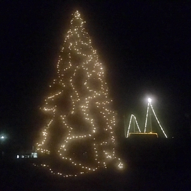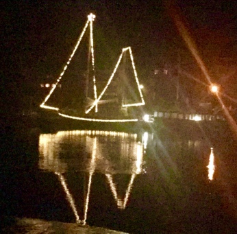 28. 11. 2018. Über die Toppen illuminiert, wartet in Oberndorf das „Flaggschiff“ des Dorfes, die SY „Heimkehr“ von Bert und Marlene Frisch, auf ihren Einsatz beim Weihnachtsmarkt am Wochenende (Foto: Bölsche). Das Einlaufen der Yacht, mit dem Nikolaus und einem Shantychor an Bord, zählt zu den Höhepunkten der Traditionsveranstaltung, die als einer der stimmungsvollsten adventlichen Märkte in Norddeutschland gilt. Die Arbeitsgemeinschaft Osteland ist wie in jedem Jahr mit einem Stand in Oberndorf vertreten.