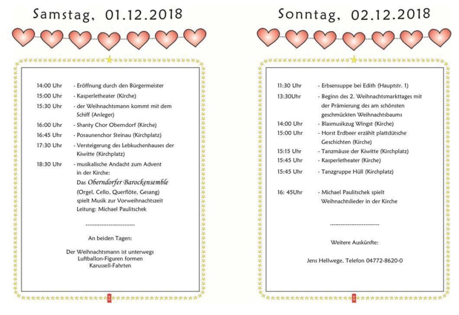 Cuxhaven, Stade und Buxtehude. Auch die Arbeitsgemeinschaft Osteland wird in Oberndorf wieder mit einem Stand vertreten sein (1. Adventswochenende am 1. und 2. Dezember). Dank für