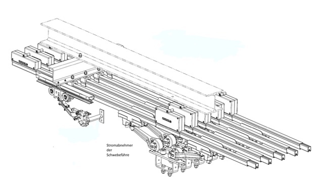 Der letzte Arbeitsschritt zur Vollendung der „Verkabelung“ der Brücke ist die Montage der Strom- und Datenschienen. Zuvor ist die Montage des erforderlichen Tragwerks zwischen den Brückenpylonen zu erledigen. Dieses Tragwerk besteht beidseits des Brückenüberbaus aus jeweils 19 Kragträgern und einem ca. 135 m langen Längsträger. Die Strom- und Datenabnehmer der neuen Schwebefähre greifen während der Fahrt über Schleifkontakte in diese Schienen ein und leiten Energie und Daten an die Motoren und die Prozesssteuerung weiter.